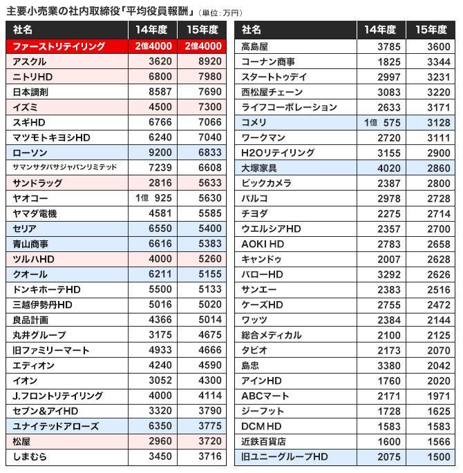 【流通役員報酬ランキング】小売りトップはユニクロ2億円超