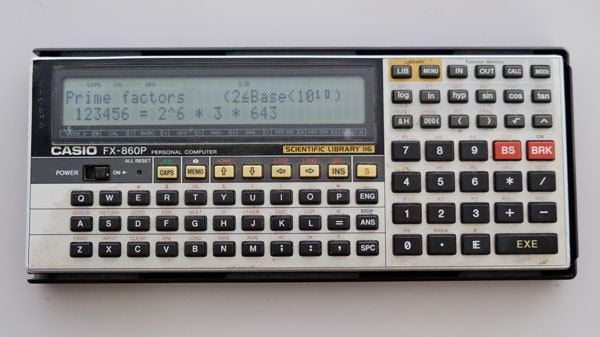 伊藤氏の私物の関数電卓「fx-860p」。さまざまな計算のライブラリが用意されており、呼び出すだけで実行できる。