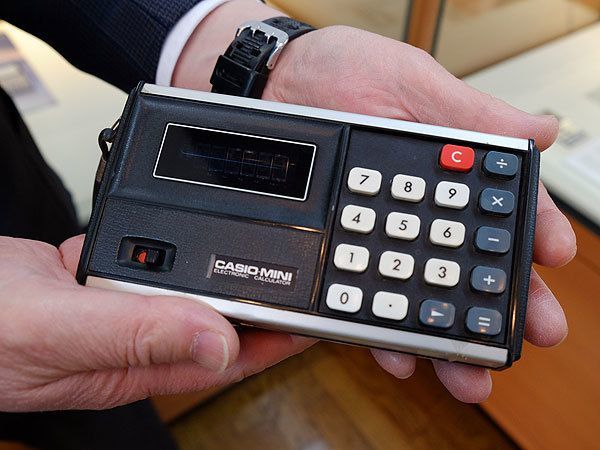 1972年発売、1万2800円と破格の安さで大ヒットした電卓「カシオミニ」。「答え一発!カシオミニ」というCMで人気を博した。これ以来、電卓は一人一台持つものになった。