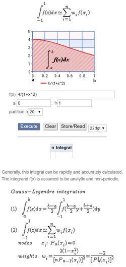 有限区間の積分を計算する「ガウス・ルジャンドル数値積分」。計算サイトのページビューは日本語対英語が10対1くらいにも関わらず、こうした学術系の計算は、日本語版よりも英語版のほうがよく使われている、と伊藤氏は心配する。