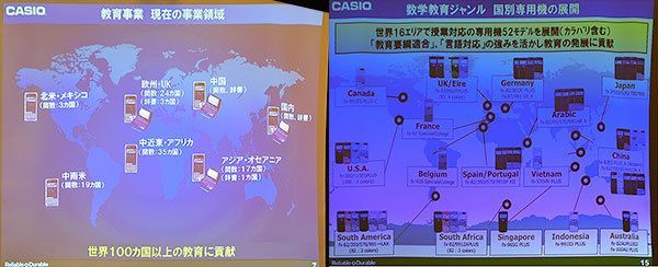 カシオは現在世界100カ国以上で関数電卓を展開し、また、国別にカスタマイズした商品を16エリアで52モデル開発・販売している。販売している全台数のうち、日本向けは1割以下だという。