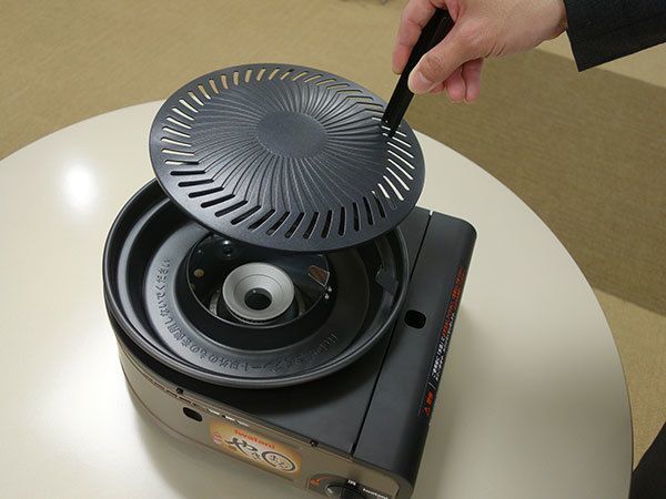 構造は非常にシンプルで、汎用カセットコンロと大差はない。なぜこれで煙が抑えられるのか?