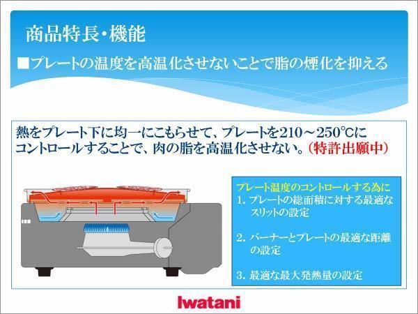 プレートの大きさやバーナーからの高さを調節し、熱をプレートに均一にこもらせ、表面の温度を一定にコントロールしている。