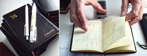 (左)愛用のシャープペンシル(B、0.5ミリ)とノック式消しゴム。いずれも無印良品製。(右)手帳の「型」は20年以上同じ。