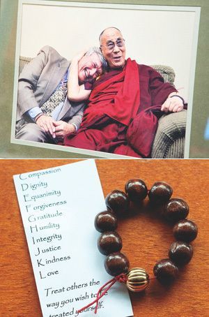 CCAREの理念に共感したダライ・ラマは多額のお金を寄付。ドゥティ氏考案の「心を開くための10カ条」を表した数珠は、慈善事業家からの贈り物。