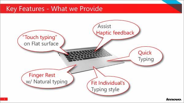 YOGA BOOKの「Haloキーボード」。普段は黒い平らな板だが、バックライトを入れるとキーボードが浮かび上がり、入力できるようになる。