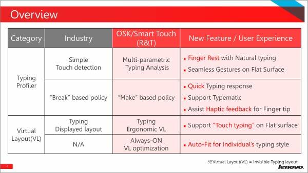 YOGA BOOKの「Haloキーボード」。普段は黒い平らな板だが、バックライトを入れるとキーボードが浮かび上がり、入力できるようになる。