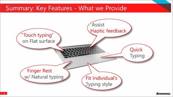 YOGA BOOKの「Haloキーボード」。普段は黒い平らな板だが、バックライトを入れるとキーボードが浮かび上がり、入力できるようになる。