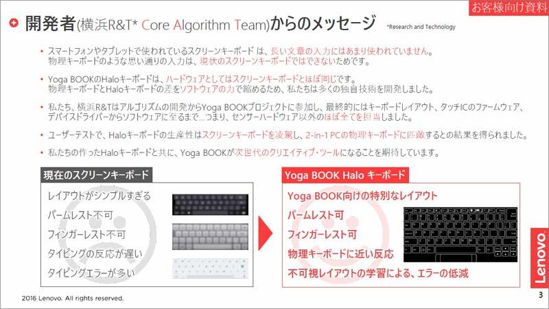 YOGA BOOKの「Haloキーボード」。普段は黒い平らな板だが、バックライトを入れるとキーボードが浮かび上がり、入力できるようになる。
