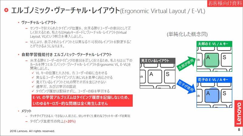 YOGA BOOKの「Haloキーボード」。普段は黒い平らな板だが、バックライトを入れるとキーボードが浮かび上がり、入力できるようになる。