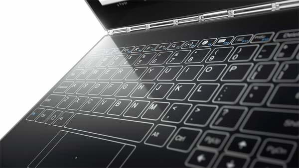 YOGA BOOKの「Haloキーボード」。普段は黒い平らな板だが、バックライトを入れるとキーボードが浮かび上がり、入力できるようになる。