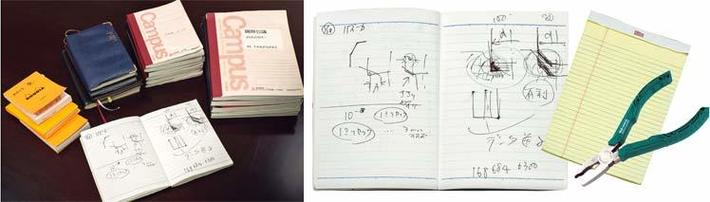 (左)社長就任以来のノート類。(右)ペンチ状の工具が看板商品の「ネジザウルス」。高崎氏愛用の黄色いノートパッドの横は「発想ノート」の実物。商品改良のアイデアは図形で描くことも多い。