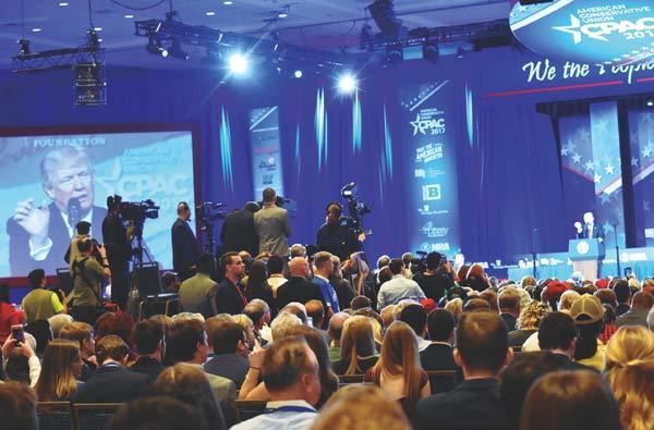 CPACメイン会場で共和党保守派リーダーに向けて演説をするトランプ大統領。(AFLO=写真)