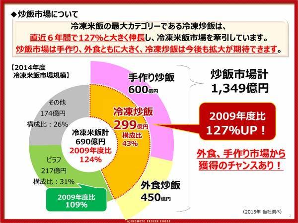 冷凍ごはんの市場自体が2009年比で124%増加。さらに冷凍チャーハンは127%アップと、チャーハン市場全体が成長している。そんな中でより美味しい冷凍チャーハンを製品化することで手作り、外食のシェアも奪える可能性がある。