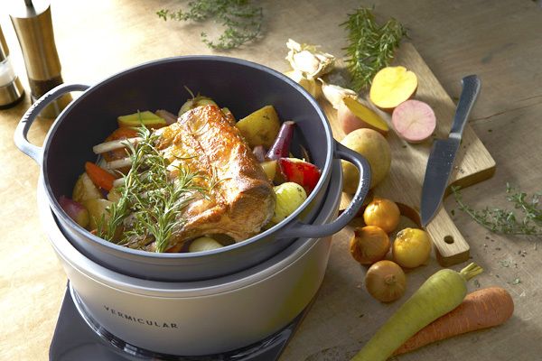 鋳物ホーロー鍋「バーミキュラ」。鉄の「効果的な熱伝導」とほうろうのもつ「保温性」により、素材の旨味を引き出しやすい温度を維持して加熱できる。