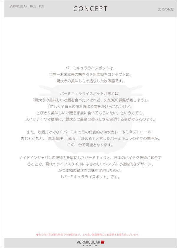 ライスポットの企画書は、商品のコンセプト説明から始まる。「最高の炊飯器でありかつ調理器具であること」がつづられている。