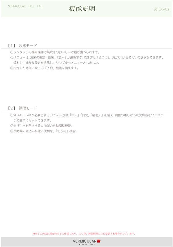 ライスポットの企画書は、商品のコンセプト説明から始まる。「最高の炊飯器でありかつ調理器具であること」がつづられている。