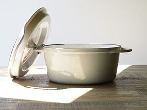 鋳物ホーロー鍋「バーミキュラ」。鉄の「効果的な熱伝導」とほうろうのもつ「保温性」により、素材の旨味を引き出しやすい温度を維持して加熱できる。