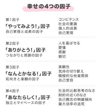 前野隆司教授の提唱する「幸せの4つの因子」は、幸福感に深く関与する心的要因を87項目リストアップし、因子分析を行うことによって導き出された研究成果である。人間の幸せな気持ちは、表にある4つの因子に分けて考えられるという。