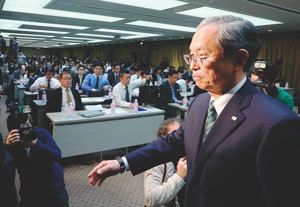 記者会見から立ち去る東芝の綱川智社長(3月29日、東京都港区の同社本社)。