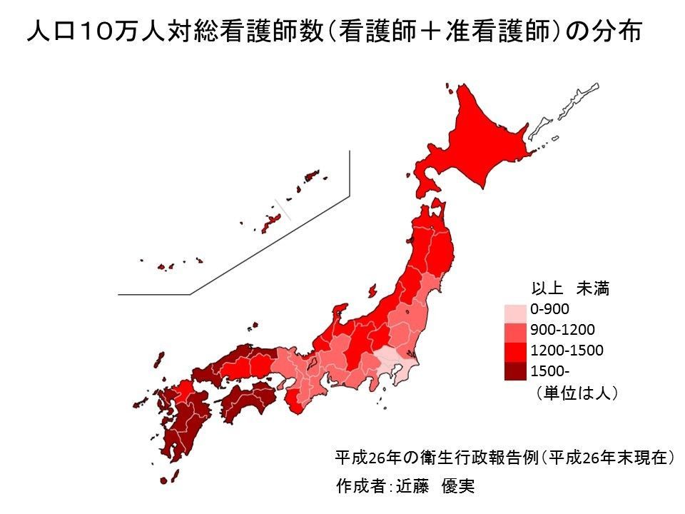 (図4)各県の人口10万人あたりの看護師数(正看護師と准看護師の合計)2014年厚労省衛生行政報告例より
