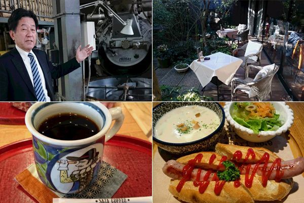 (左上から時計回りに)ドイツ・プロバット社の大型焙煎機を説明する鈴木誉志男氏/本店のテラス席/人気フードの「ホットドッグとクラムチャウダー」/コーヒーは器にもこだわって提供