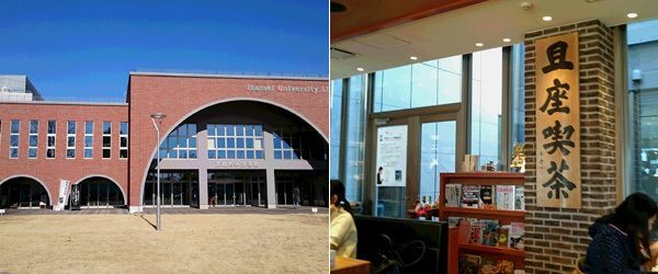 (左)茨城大学図書館1階にあるサザコーヒーライブラリーカフェ(正面左)(右)茨城大学ライブラリーカフェ店内の「且座喫茶」看板
