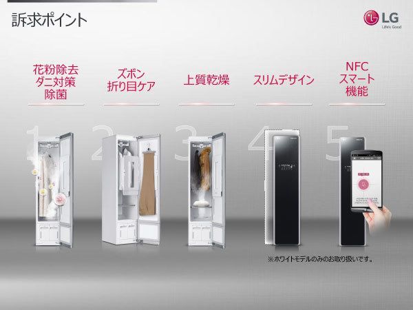 家庭用クリーニング機「LG styler」。左は服を掛けたところ、右はズボンの折り目ケア機能を使用しているところ。