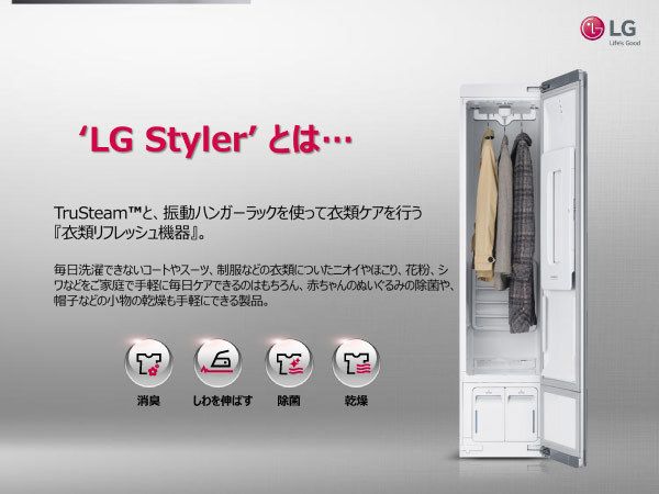 一番右が2011年に発売した初代LG styler、中央が2015年に発売した二代目。左はプロトタイプ。