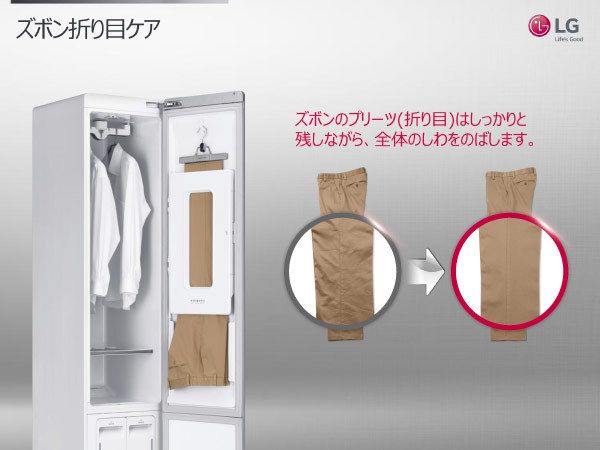 家庭用クリーニング機「LG styler」。左は服を掛けたところ、右はズボンの折り目ケア機能を使用しているところ。