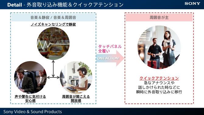 人に話しかけられたときなどは、右側のハウジングを手で覆うと、音楽の音量が下がって外音が聞こえるようになる(クイックアテンションモード)。