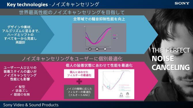個人に合わせてノイズキャンセリング機能をチューニングする「パーソナルNCオプティマイザー」。髪型や眼鏡の有無などによる効きの差を調整する。