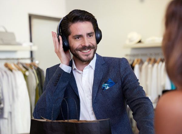 飛行機によく乗る人には何かと便利なMDR-1000X。女性にもよく似合うデザインだ。
