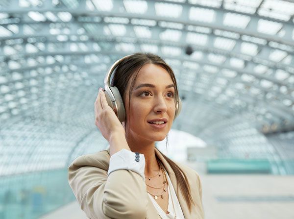飛行機によく乗る人には何かと便利なMDR-1000X。女性にもよく似合うデザインだ。