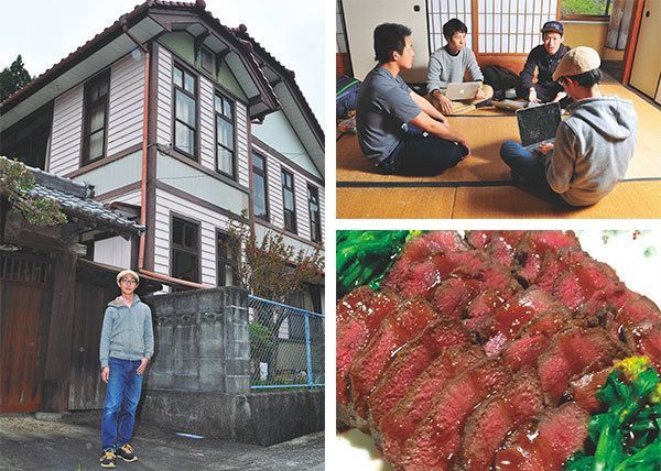 築100年以上の洋館を活用したシェアハウス「ハヤシはうす」の前に立つイケダハヤトさん(写真左)。そのイケダさんは若手移住者の相談役、お兄さん的な立場でもある(写真右上)。おすそ分けでもらった鹿は自分たちで解体して、美味しくいただく(写真右下)。