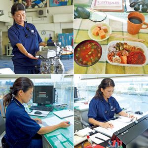 (左上から時計回りに)現場に下りて水面のチェックとともに、選手やボートの様子もチェック。/レースが始まる前に作業をしながらパパッとランチ。/レース中は、監視席に座って細かくチェック。/比良野さんのデスクは、レースが真下に見下ろせる位置。
