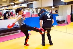 練習の仕上げはミット打ち! 本気でキックを打ち込むのが気分爽快。