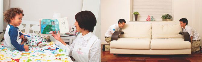 (右)ベアーズ●力仕事だけを依頼できるプラン“マッスルベアーズ”。部屋の模様替えにも大活躍。(左)ポピンズ●“ナニー(ベビーシッター)サービス”は、近くに頼れる親がいない共働き夫婦の救世主。