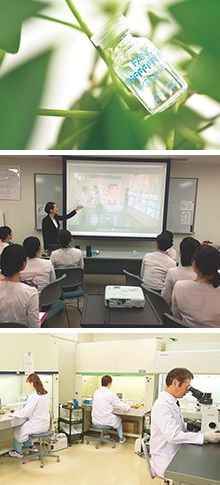 (上)ファンケル創業のシンボルともいえる5mlの無添加化粧品。医薬品のような飾り気のない容器(バイアル瓶)を使用。(中)社員研修施設「ファンケル大学」の様子。(下)ファンケル総合研究所内の敷地内に2016年5月に完成した「第二研究所」の研究風景。