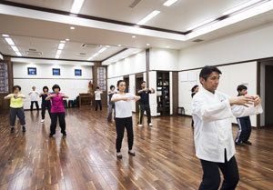 見よう見まねで、型を練習。正宗太極拳には99の型があるが、動きに切れ目がなく30分以上かけてこなしていく。