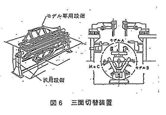 1980年代、マツダの工場で使われていた三面回転式の治具台座。ファミリア、カペラ、ルーチェの3車種を同じ台座で作ることができる。