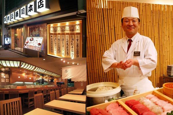 (左上)築地玉寿司本店(外観)(右上)築地玉寿司本店(カウンター)(右)築地玉寿司は離職率が非常に低く長く勤める寿司職人も多い