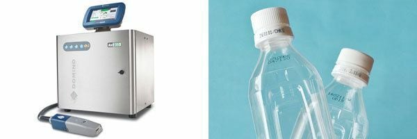 (左)ドミノ社のコーディング・マーキング機器 (右)ドミノ社の機器での印刷結果。ペットボトルに消費期限などを印刷する