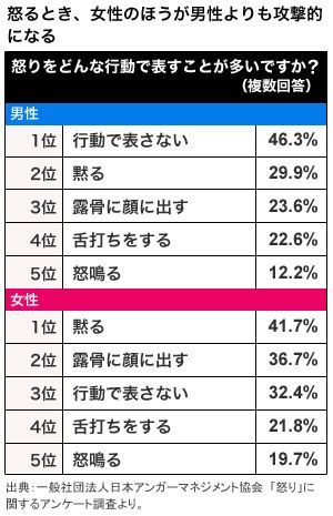 *「露骨に顔に出す」「怒鳴る」のほか「相手をけなす」「モノにあたる」「手がでる」といった相手を攻撃するような行動も、男性よりも女性のほうが割合が高かった。