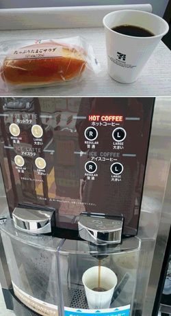 (上)コンビニコーヒーとパン(下)コンビニ店内の自動抽出器