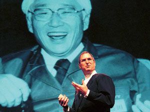 盛田昭夫氏への追悼の意を表するスティーブ・ジョブズ氏。(時事通信フォト=写真)