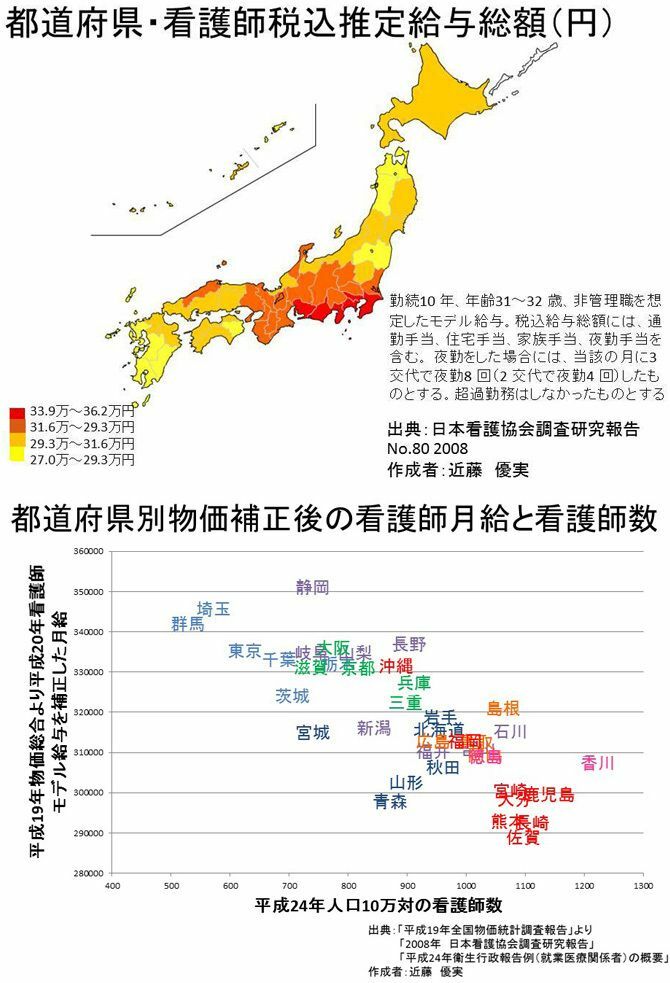 図上:日本看護協会調査研究報告No.80 2008を元に、近藤優実氏が作成。/図下:平成19年度全国物価統計調査報告、08年日本看護協会調査研究報告、平成24年衛生行政報告例を用いて、近藤優実氏(東京医療保健大)が作成。