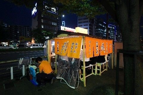 座談会の会場となった福岡市・天神の屋台。ゴールデンウイーク明け初日とあって、人通りは少なかった(撮影・佐藤桂一)