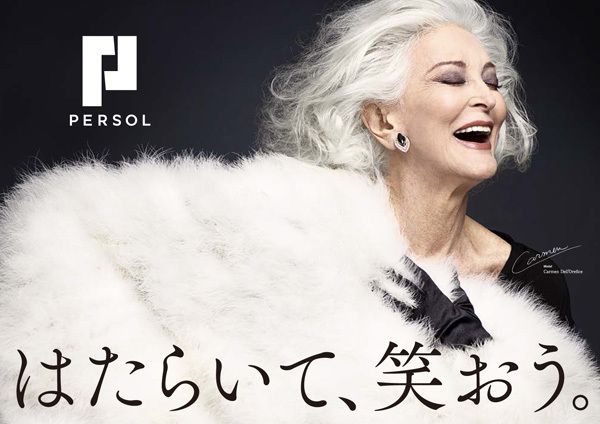 パーソルホールディングスのグループブランド「PERSOL」CMのグラフィック画像より(以下同)。写真は現役の世界的スーパーモデル、カルメン・デロリフィチェさん。85歳。