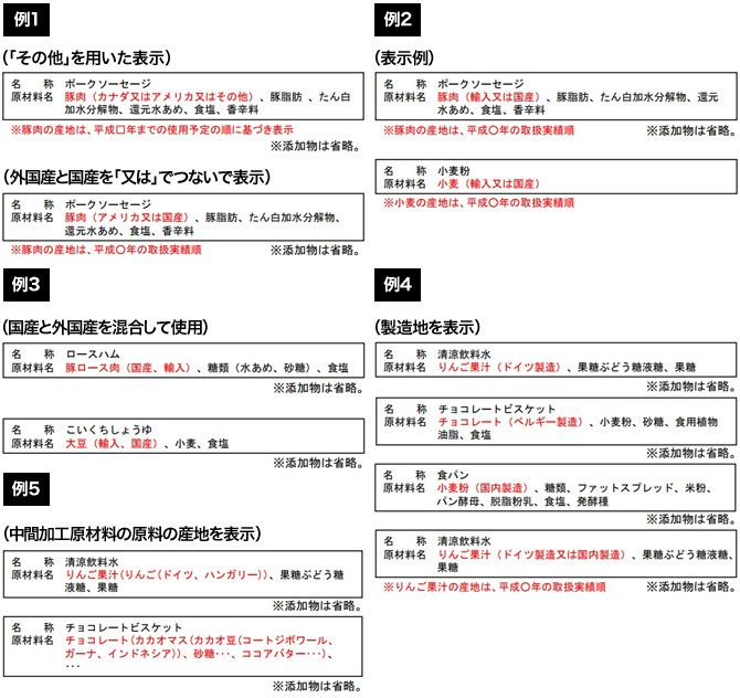 【例1】大括り表示の例。第9回 加工食品の原料原産地表示制度に関する検討会(平成28年10月5日開催)の「資料1」より抜粋。以下同じ。【例2】大括り表示+可能性表示の例【例3】大括り表示【例4】中間加工原料の製造地表示【例5】中間加工原料の製造地表示